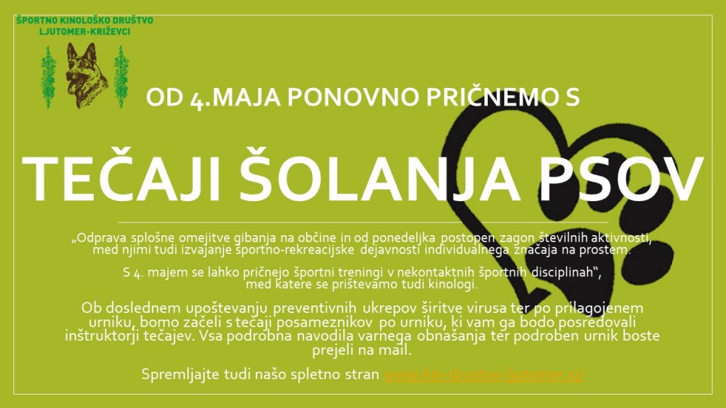 "S 4. majem se lahko pričnejo športni treningi v nekontaktnih športnih disciplinah“, med katere se prištevamo tudi kinologi, so najpomembnejši sprostitveni ukrepi ob katerih smo se odločili, da nadaljujemo s tečaji šolanja psov vseh stopenj.